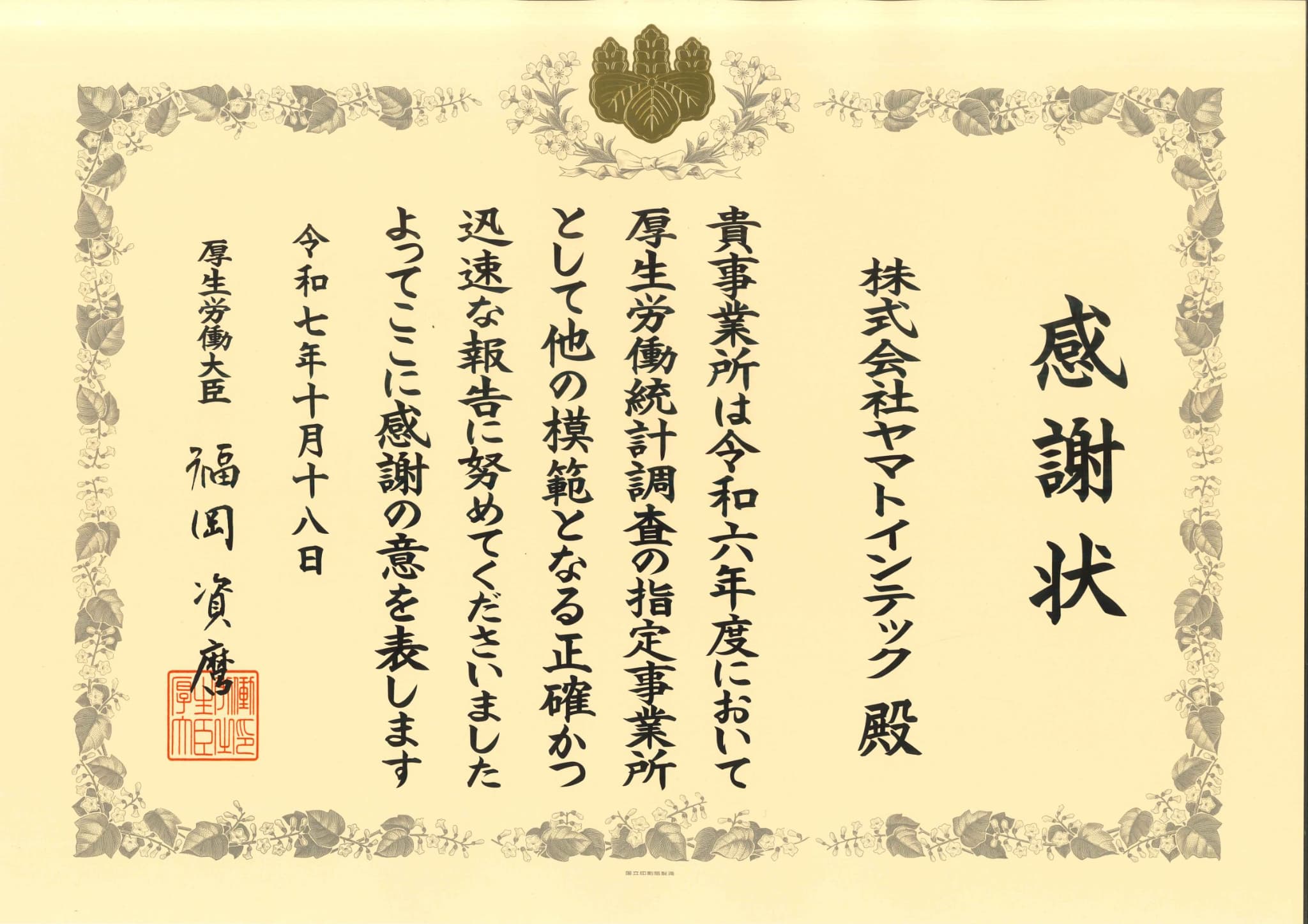このたび当社は、厚生労働省が実施する統計調査において、指定事業所としての調査協力体制および報告内容が高く評価され、模範事業所として表彰を受けました。